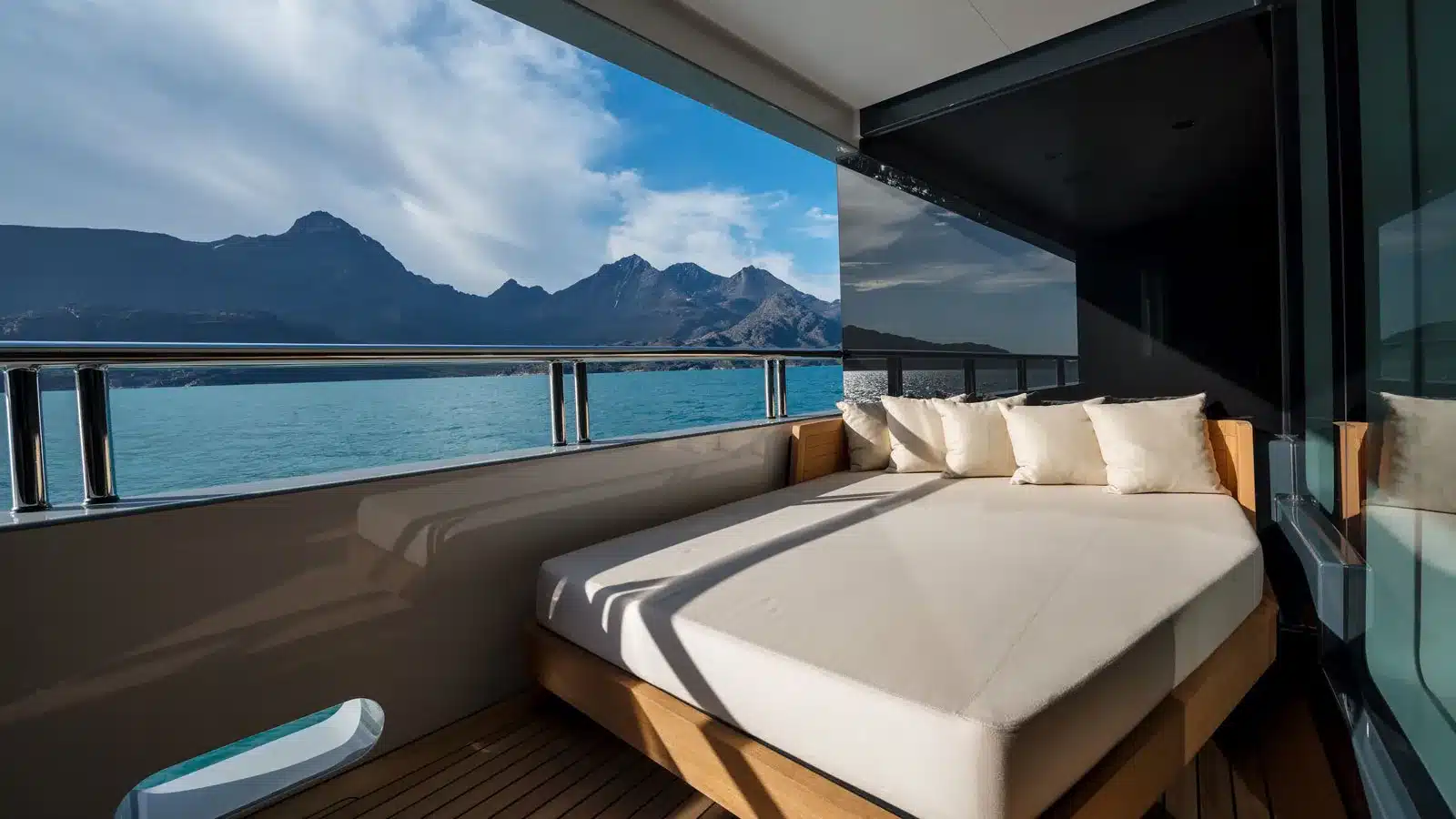 Cloudbreak’in iç mekânları, kayak kulübü estetiğinde sıcak malzemelerle döşendi. Hornbeam ve meşe zeminler, sıvıambar kaplamalar ve büyük cam yüzeyler, yatın ferahlığını artırıyor. 12 konuğu ağırlayabilen teknede, helikopter pisti, kış bahçesi, dış yataklar, sinema, sauna, spa ve geniş bir su sporu ekipmanı deposu bulunuyor.