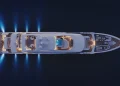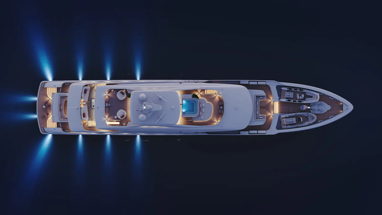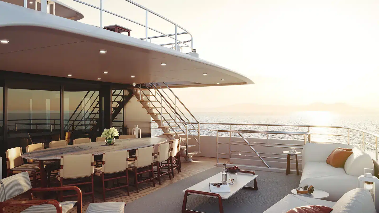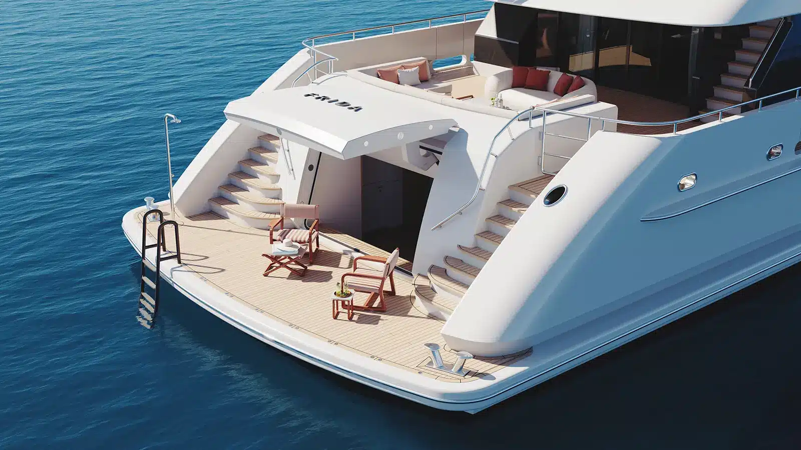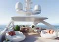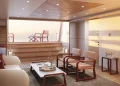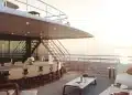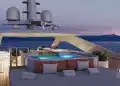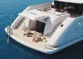 Kıç bölümde konumlanan beach club alanı; sauna, spor salonu ve denize doğrudan erişim sağlayan yüzme platformuyla tamamlanıyor. Sütunsuz salon tasarımı sayesinde iç ve dış mekânlar arasında kesintisiz bir görüş hattı oluşturulmuş durumda.