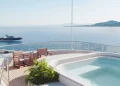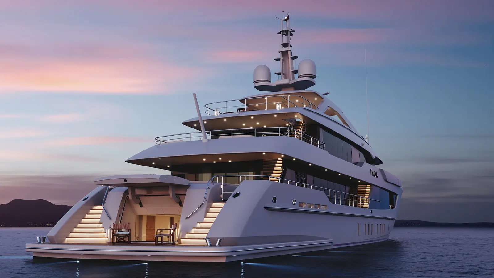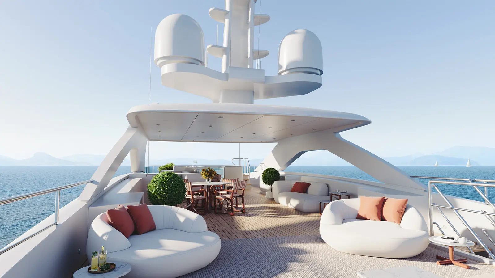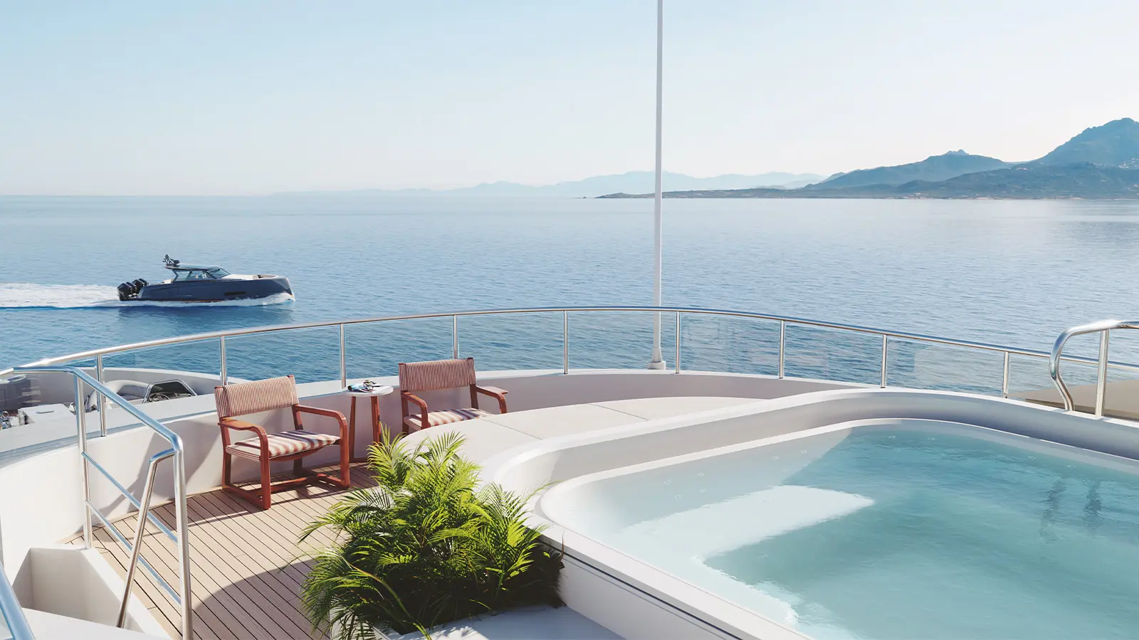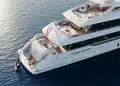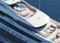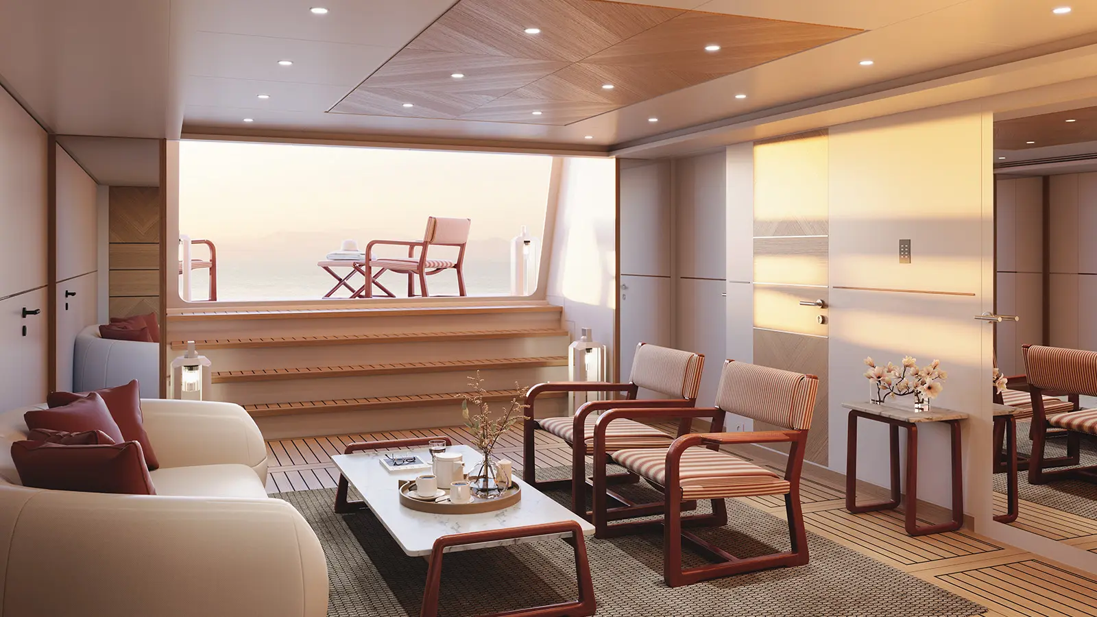 Kıç bölümde konumlanan beach club alanı; sauna, spor salonu ve denize doğrudan erişim sağlayan yüzme platformuyla tamamlanıyor. Sütunsuz salon tasarımı sayesinde iç ve dış mekânlar arasında kesintisiz bir görüş hattı oluşturulmuş durumda.