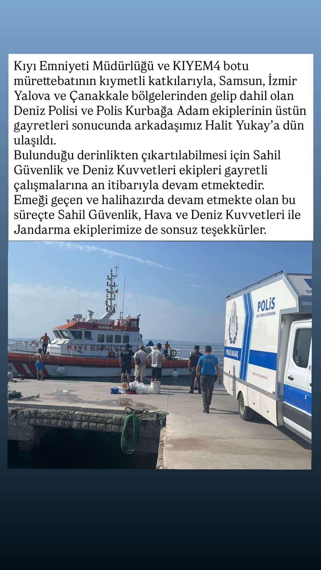 Tatlıtuğ, paylaştığı mesajda Kıyı Emniyeti ve KIYEM4 botu mürettebatının yanı sıra Samsun, İzmir, Yalova ve Çanakkale bölgelerinden çalışmalara katılan Deniz Polisi ve Polis Kurbağa Adam ekiplerinin üstün gayretleri sonucunda Yukay’a ulaşıldığını belirtti.