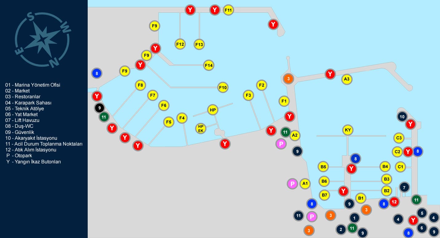 Marina, denizde yaklaşık 1.300 yat bağlama kapasitesine, karada ise 220 tekne park alanına sahip. Toplam kapasite itibarıyla 1.500’ün üzerinde tekneye hizmet verebilecek ölçekte planlanan tesis, Türkiye’nin en büyük marina kompleksleri arasında yer alıyor. 65 metreye kadar yat kabul edebilen marinanın rıhtım ve iskelelerinde maksimum derinlik 6,5 metre seviyesinde bulunuyor. Marina genelinde tonoz sistemi uygulanıyor ve bu nedenle demirleme yapılmasına izin verilmiyor. Tüm bağlama ve ayrılma işlemleri palamar botları eşliğinde gerçekleştiriliyor.