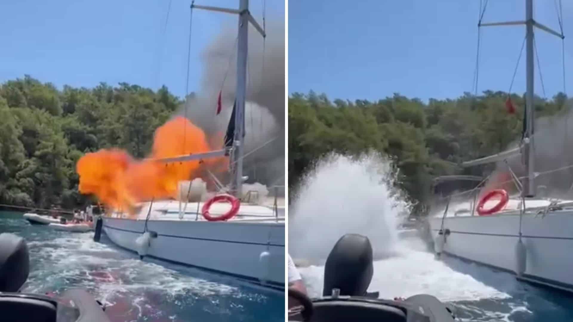 Görgü tanıklarının cep telefonu kameralarına yansıyan görüntülerde, teknenin birkaç dakika içerisinde yoğun duman ve alevlere teslim olduğu görüldü.