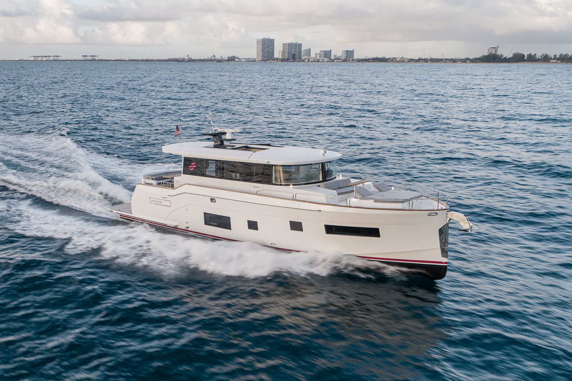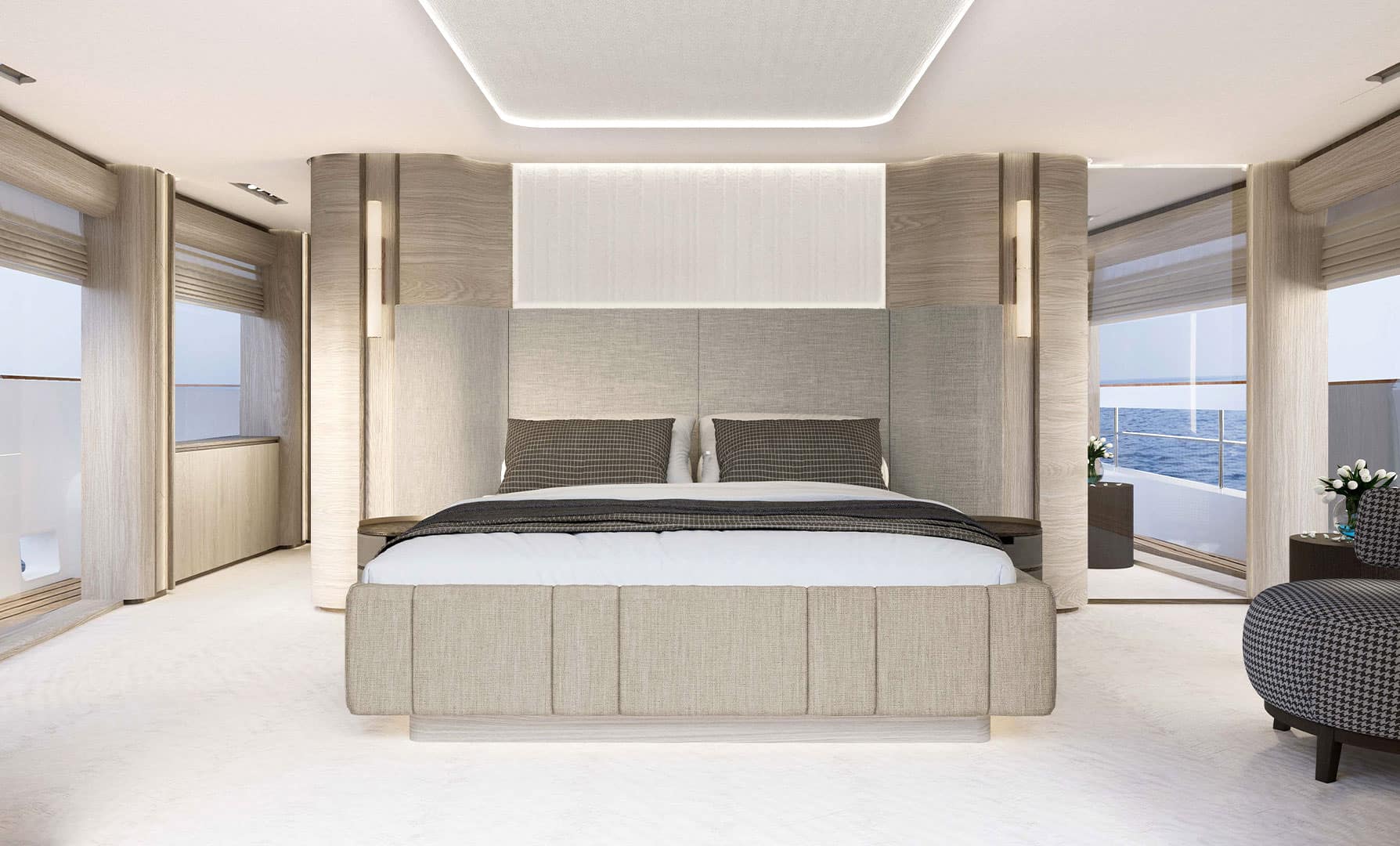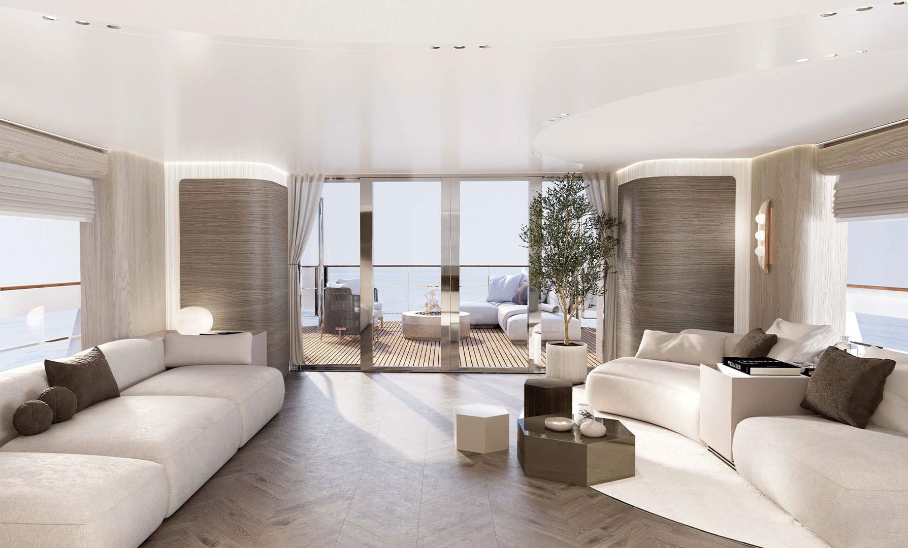 Projenin dış ve iç çizgileri Sirena Yachts’ın kendi tasarım ekibine ait. Deniz mimarisi Germán Frers, iç mekânlar Cor D. Rover imzası taşıyor. İç düzenlemede doğal ışığı öne çıkaran, açık tonlu ahşaplar, krem döşemeler ve bronz detaylarla sakin bir atmosfer hedefleniyor.