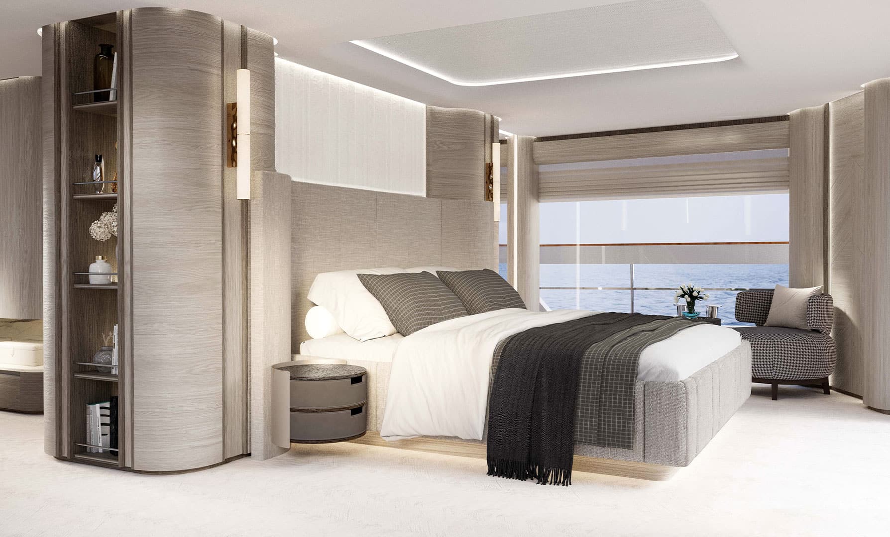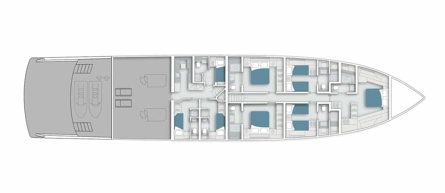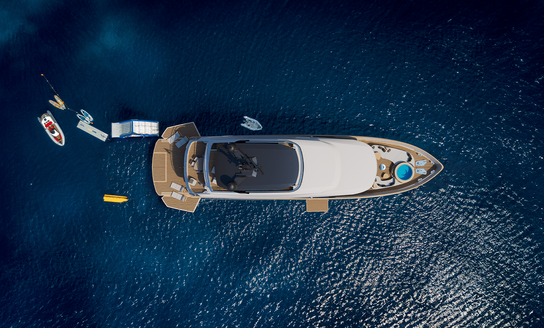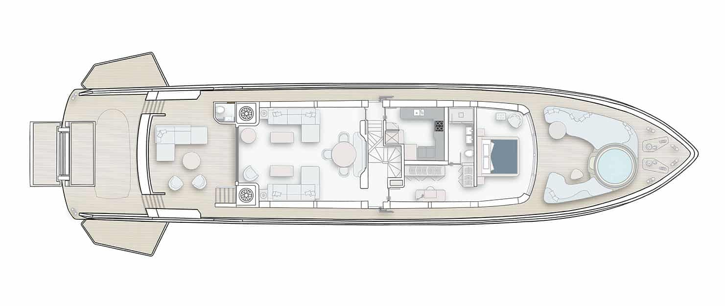 Sub-300 GT hacimde tasarlanan Sirena 118, esnek tri-deck yerleşim sunuyor. Ana güvertede tam genişlikte sahibi alanı bulunuyor; talebe bağlı iki güverteye yayılan “loft” seçeneği, alt güvertedeki özel dinlenme alanına spiral merdivenle bağlanıyor. Alt güvertede bir VIP süit ve dört misafir kamarasıyla toplam 12 misafire konaklama sağlanıyor. Üst güvertede sosyal alanlar, ana güverte kıçta yemek ve lounge düzeni, baş kısımda jakuzi ve güneşlenme alanları yer alıyor.
