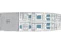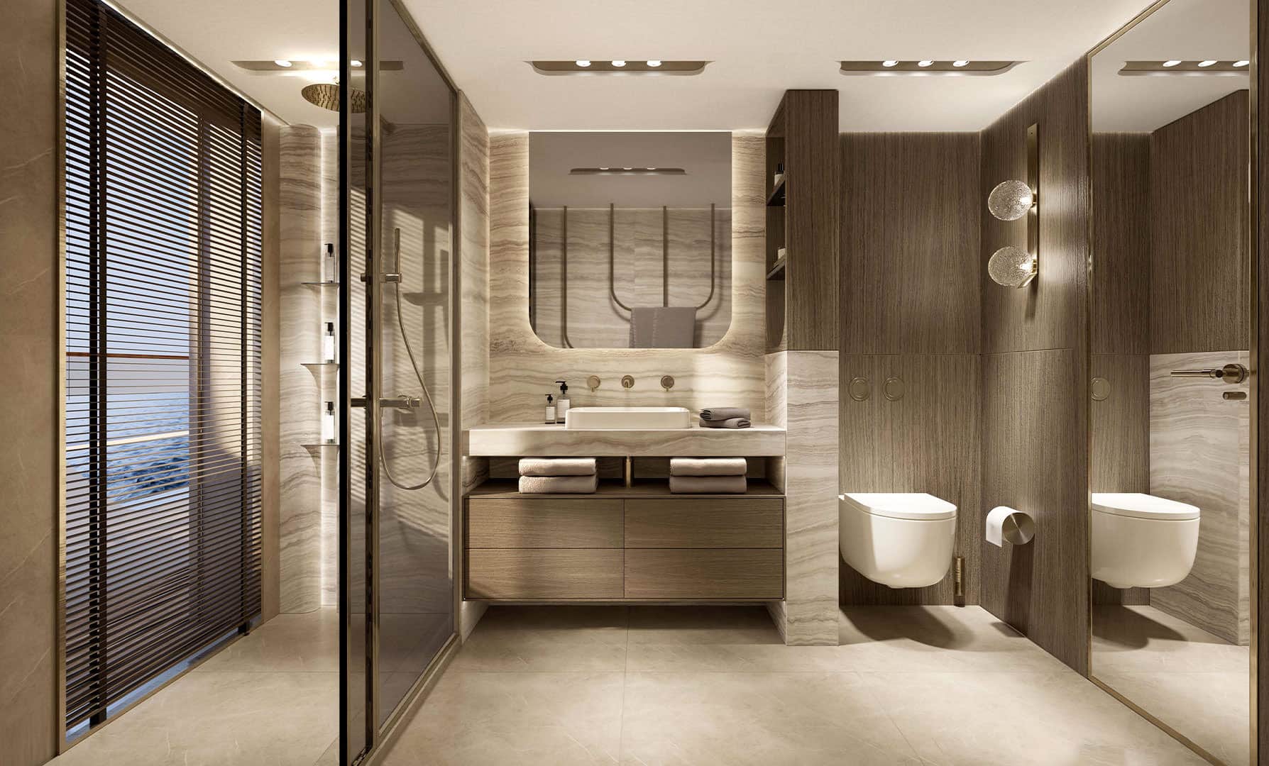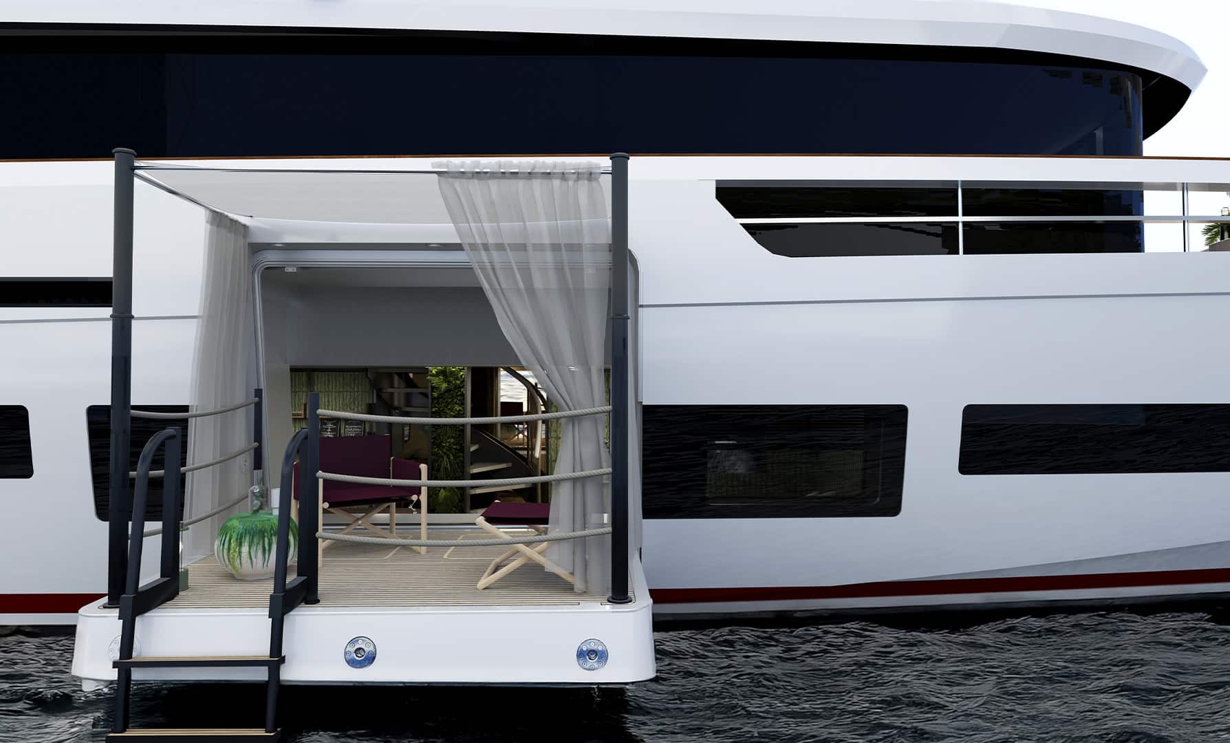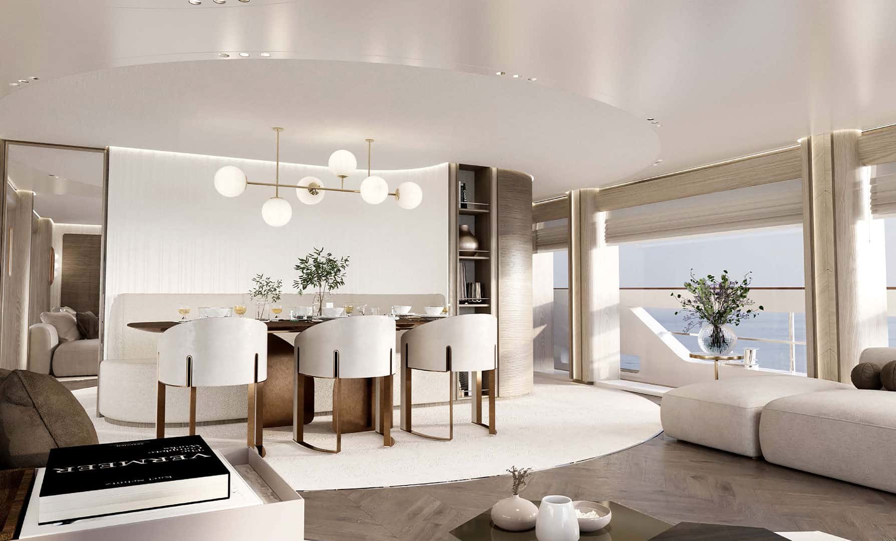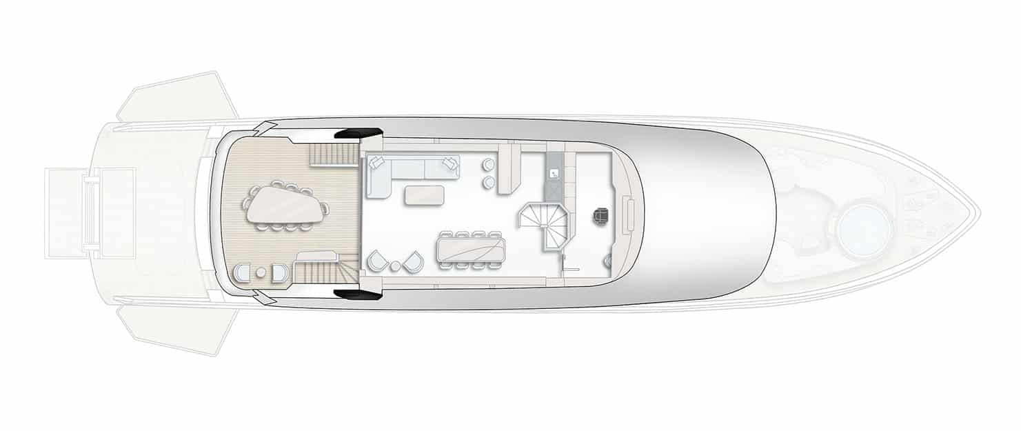 Sub-300 GT hacimde tasarlanan Sirena 118, esnek tri-deck yerleşim sunuyor. Ana güvertede tam genişlikte sahibi alanı bulunuyor; talebe bağlı iki güverteye yayılan “loft” seçeneği, alt güvertedeki özel dinlenme alanına spiral merdivenle bağlanıyor. Alt güvertede bir VIP süit ve dört misafir kamarasıyla toplam 12 misafire konaklama sağlanıyor. Üst güvertede sosyal alanlar, ana güverte kıçta yemek ve lounge düzeni, baş kısımda jakuzi ve güneşlenme alanları yer alıyor.