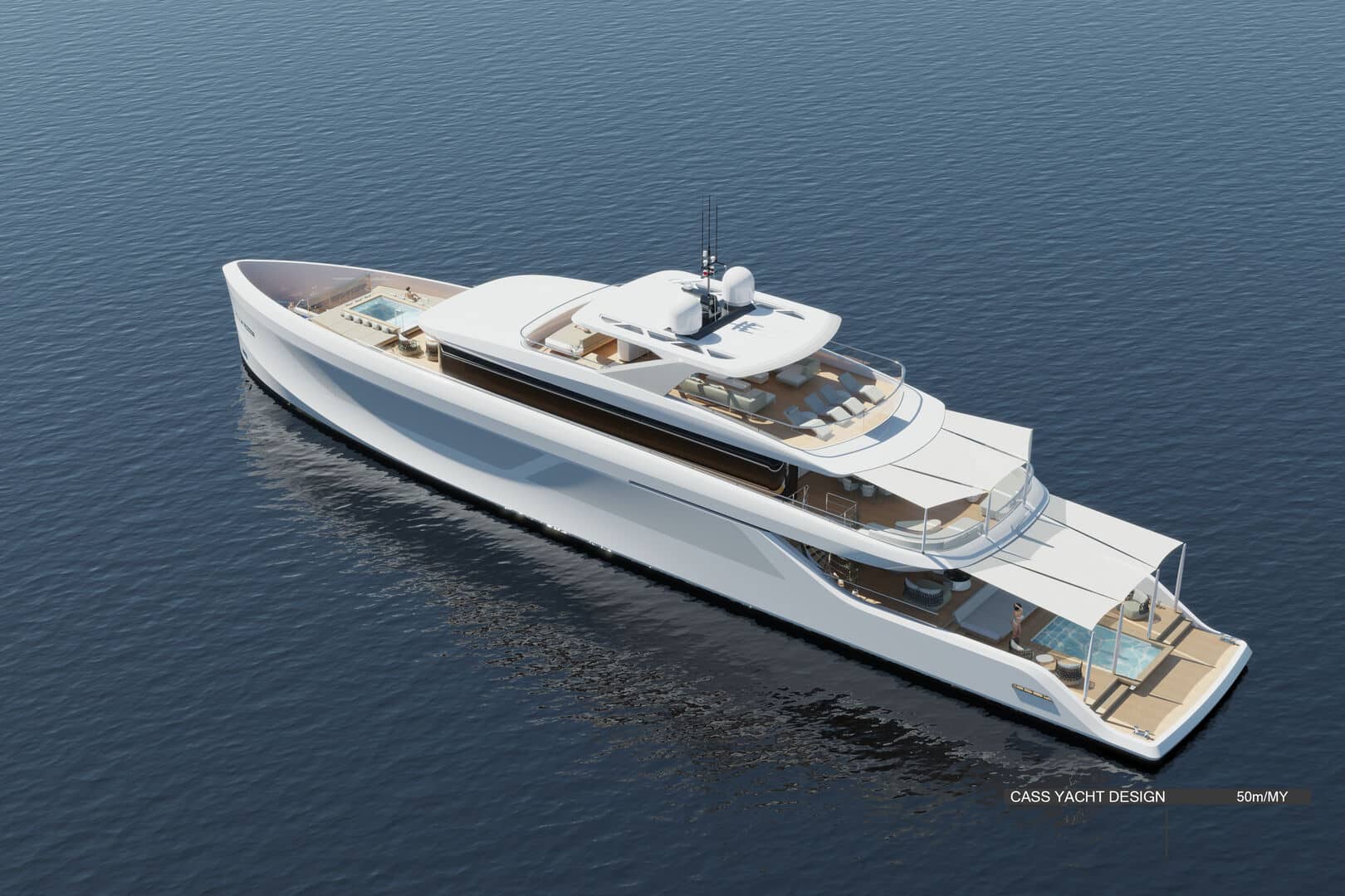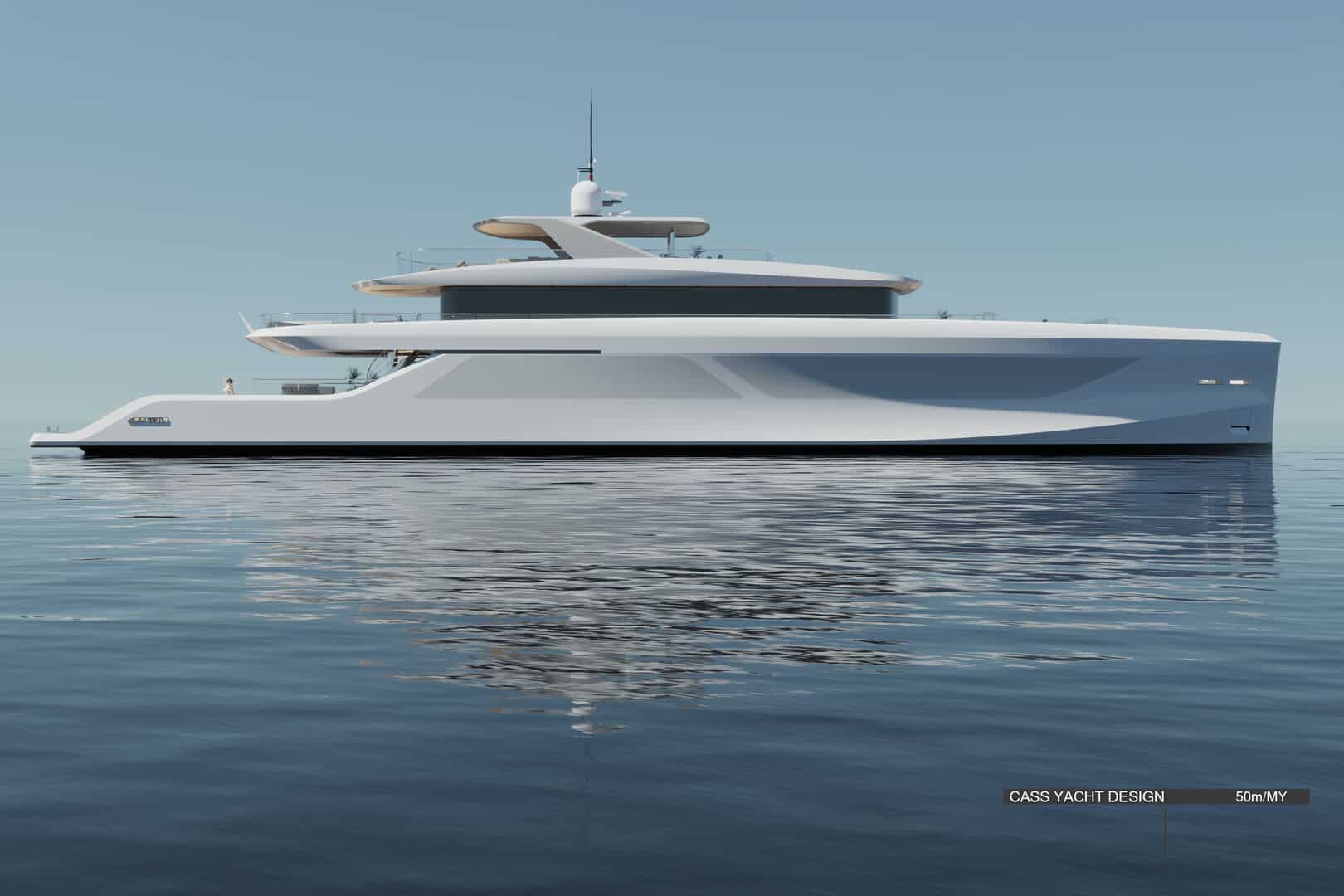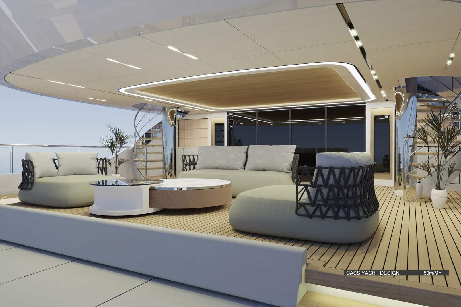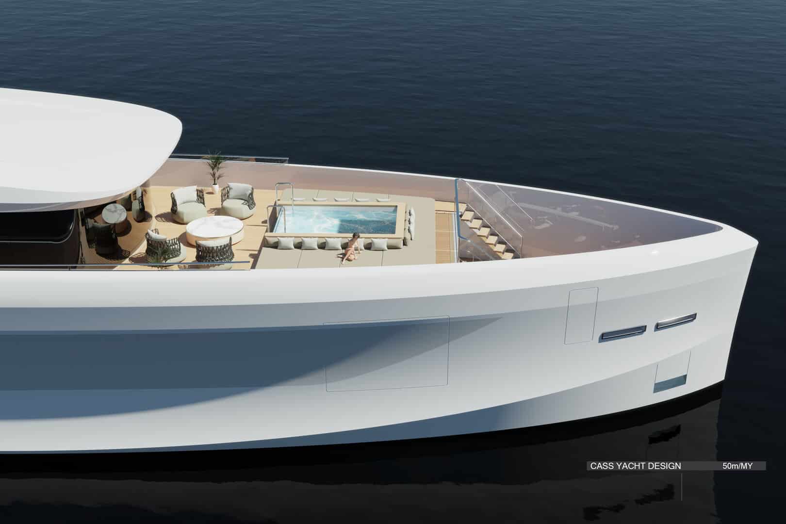 50 metrelik konseptte ise farklı bir çözüm öne çıkıyor. Geleneksel yan yürüyüş yolları iç hacme dahil edilerek, salon ve kamaralarda tam genişlikte (full-beam) kullanım sağlanıyor. Bu sayede daha geniş iç mekânlar elde edilirken, yerden tavana cam yüzeylerle denizle görsel bağ güçlendiriliyor.