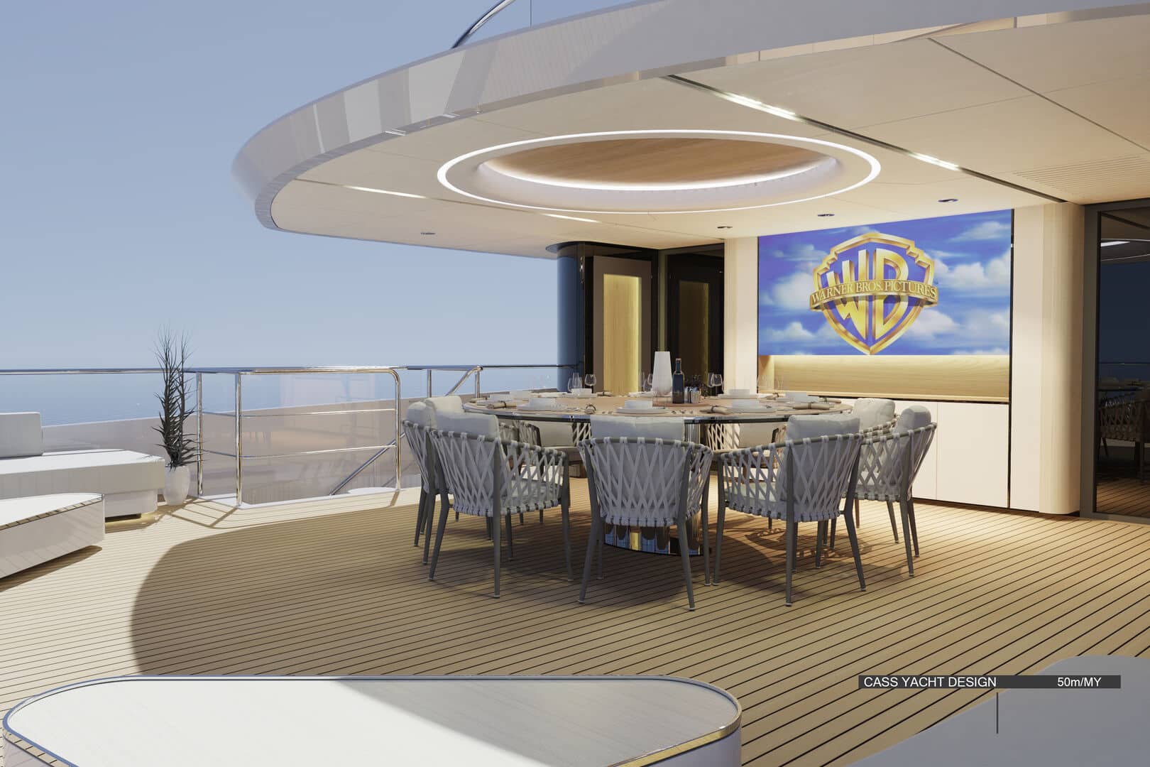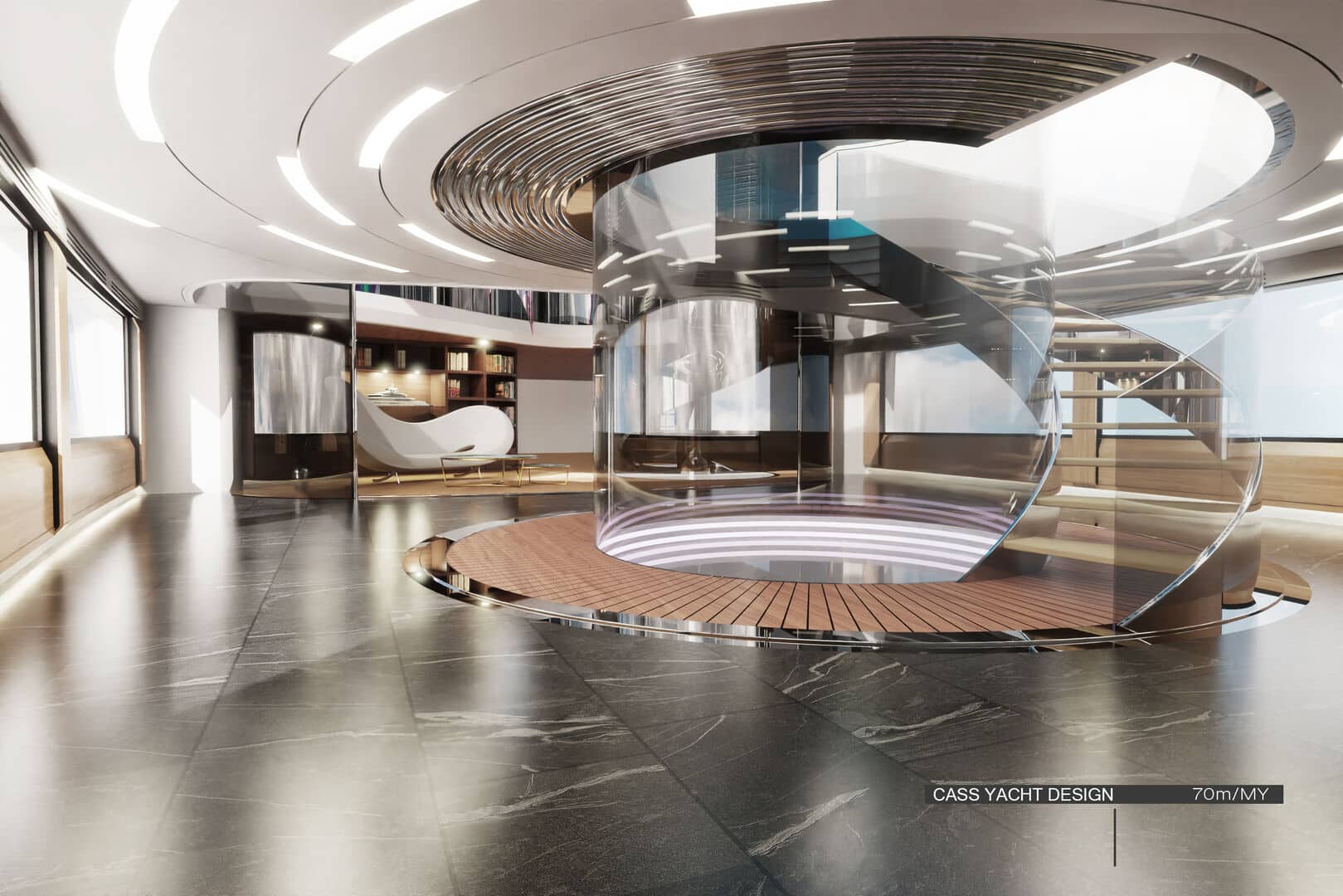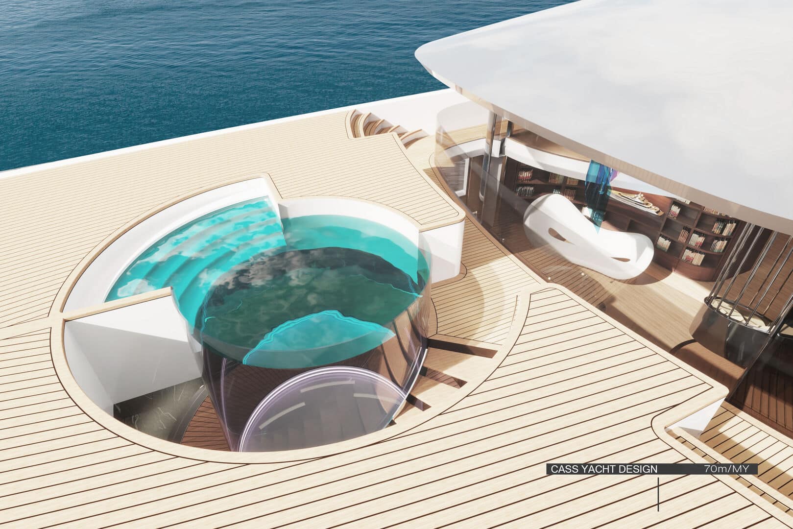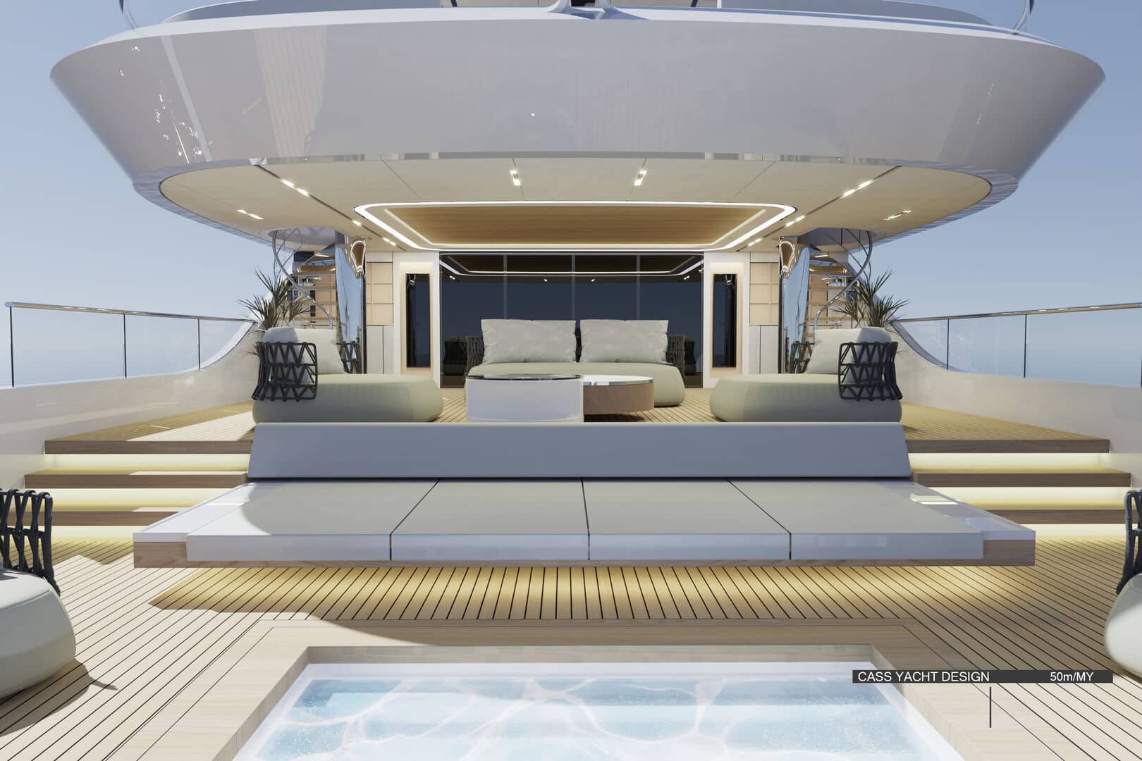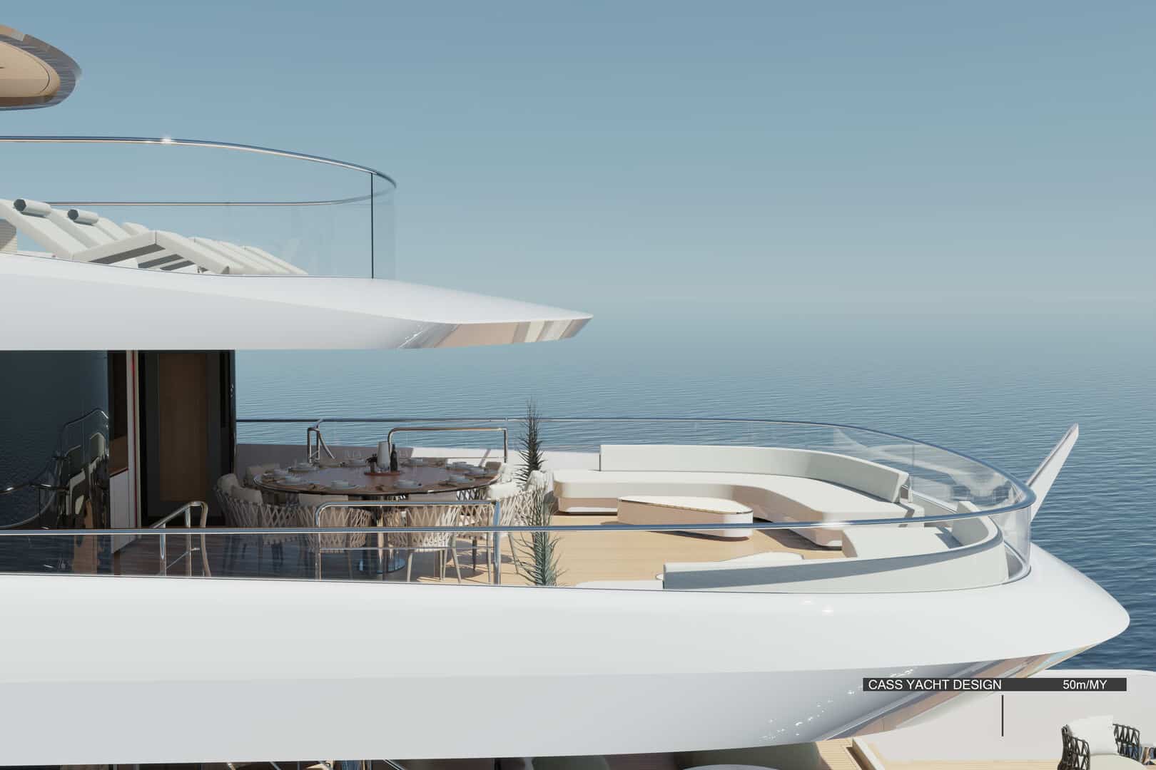 50 metrelik konseptte ise farklı bir çözüm öne çıkıyor. Geleneksel yan yürüyüş yolları iç hacme dahil edilerek, salon ve kamaralarda tam genişlikte (full-beam) kullanım sağlanıyor. Bu sayede daha geniş iç mekânlar elde edilirken, yerden tavana cam yüzeylerle denizle görsel bağ güçlendiriliyor.