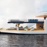 70 metrelik tasarımda kıç tarafta konumlanan geniş açılır kapaklar, kapalı bir iç mekânı kısa sürede denizle bütünleşen bir beach house alanına dönüştürüyor. Kapaklar açıldığında, kullanıcılar su seviyesine yakın, kesintisiz bir açık alanla doğrudan temas kurabiliyor.