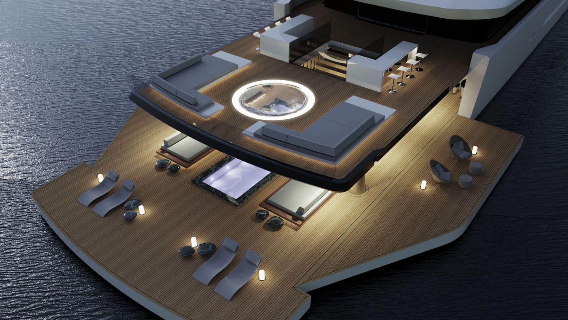 Açık alanlar kapalı hacimlerin önünde yat tasarımı